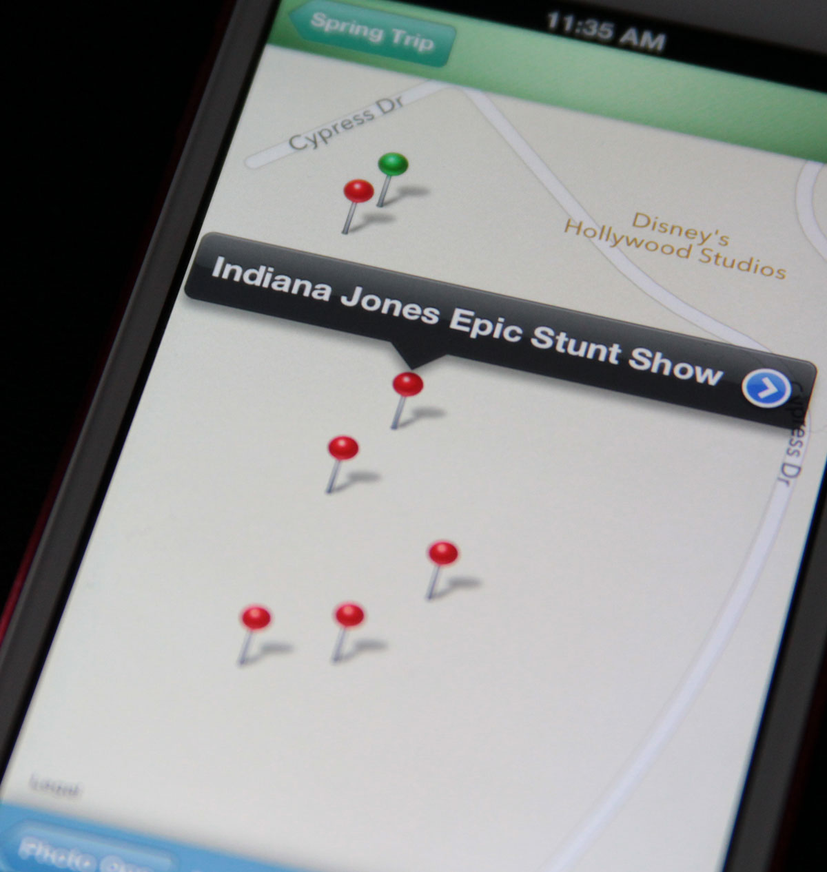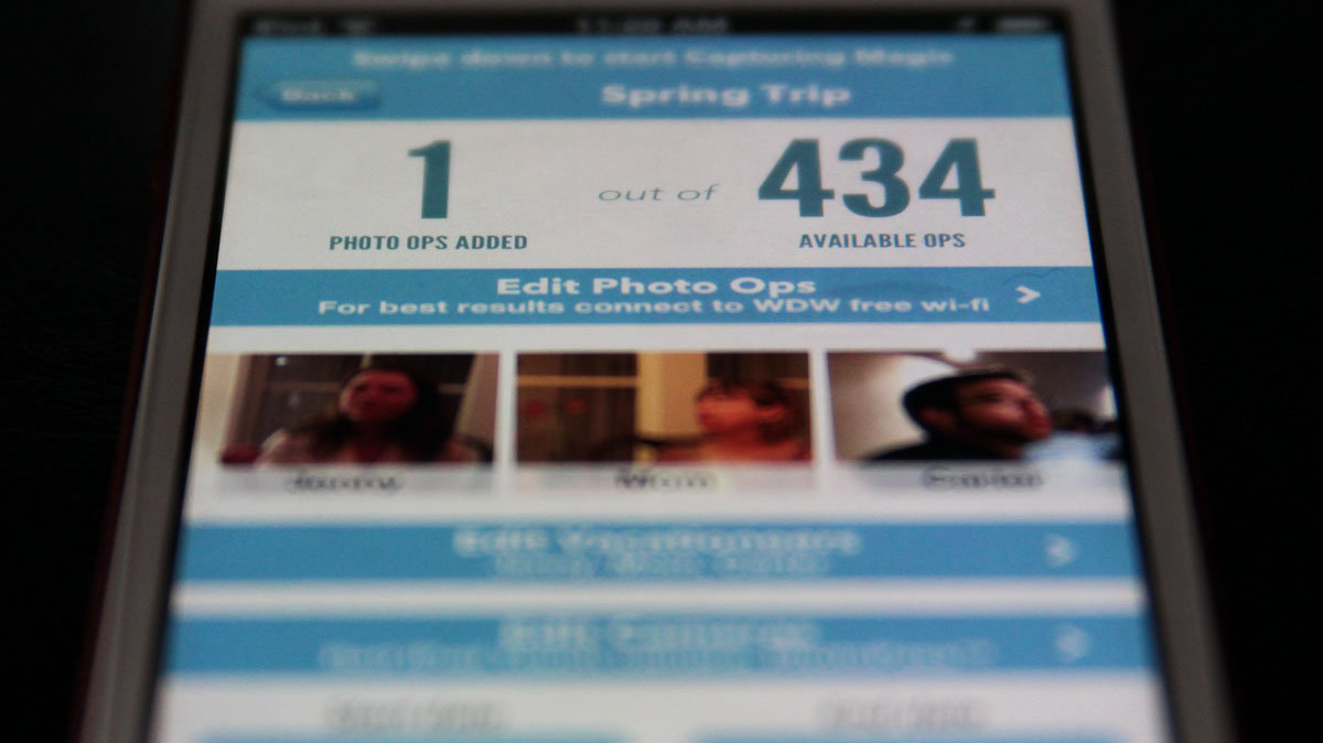 You create vacations and add people to them. You then go through the massive list of Landmarks and Memories that the app is pre-loaded with, and you create photo op reminders to which you add people. During your trip to the park, you can access your list of photo ops, sorted by their proximity to you. If you get close enough to one you'll get a notification.
